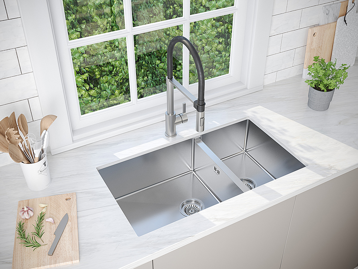 Габариты мойки составляют 780х440мм, две вместительные чаши обеспечивают максимальное пространство и удобство для мытья посуды и продуктов. Возможен подстольный, накладной монтаж или монтаж вровень со столешницей.